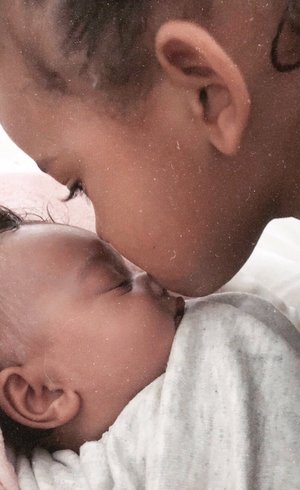 Na legenda, ela escreveu: "He loves her so much" (ele a ama tanto), indicando tratar-se de seu filho Saint West fazendo um carinho na caçula, Chicago, que foi gerada por barriga de aluguel.