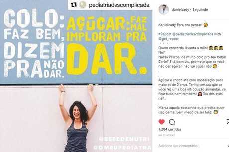 “Nessa Páscoa, dê muito colo pro seu bebê! Certo? E tá bom viu, prometo que se você não der açúcar, não vai aguar não. Açúcar e chocolate com moderação pros maiores de 2 anos. Tenho certeza que se você fez uma boa introdução alimentar, vai ficar tudo bem também! Dia dos avós né? Marca aquela pessoinha que precisa ouvir isso gente! Sem medo de ser feliz!”.