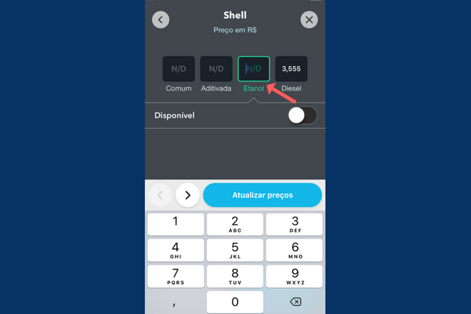 Para indicar um novo preço, clique no combustível que você deseja indicar o valor, digite no teclado numérico o preço e clique em atualizar preços