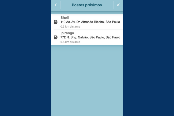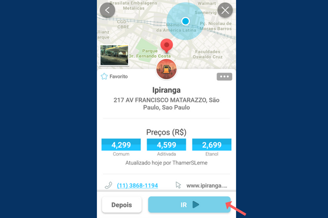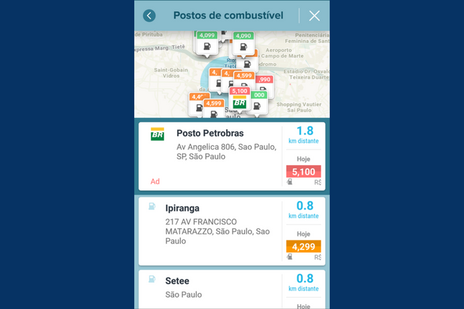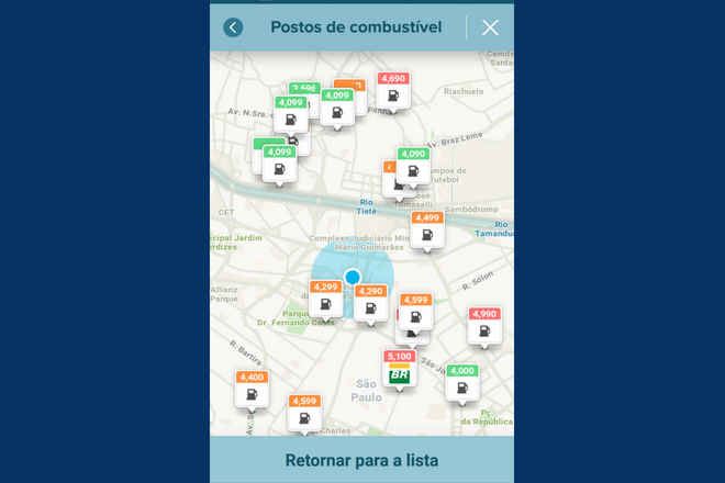 Em seguida, o Waze irá indicar os postos de combustível que estão próximo da sua localização. A ordem preferencial do aplicativo é do mais perto para o mais longe. Os postos que tiverem combustível disponível terão o preço indicado ao lado