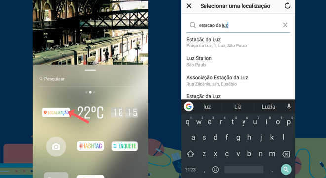 Mostre aos seus amigos onde aquela foto legal foi tirada. Deslize o dedo para cima e toque sobre localização. Uma tela de pesquisa será exibida para você procurar pelo endereço ou pelo nome do lugar