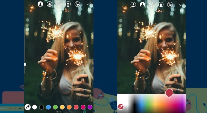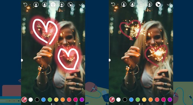 Não precisa ser nenhum artista para brincar de desenhar sobre as fotos. Primeiro, toque sobre o desenho de uma caneta no topo da foto e escolha uma das 4 opções: ponta fina, ponta grossa, luz e giz. Depois, use o dedo para fazer os traços
