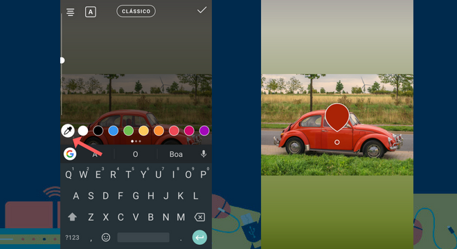 Após selecionar o conta-gotas, toque sobre um objeto na foto para selecionar a cor . Em seguida, escreva algo e coloque em um ponto de destaque na foto