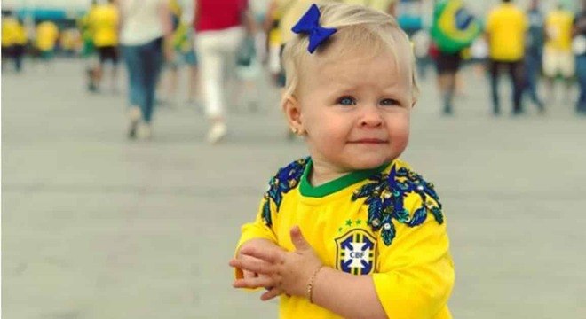 Na imagem postada pela mãe, a pequena assiste ao jogo do Brasil no estádio Arena Zenit em São Petersburgo com uma expressão bem séria. Ao postar a imagem, Natália disse: “Torcendo pelo papai”.