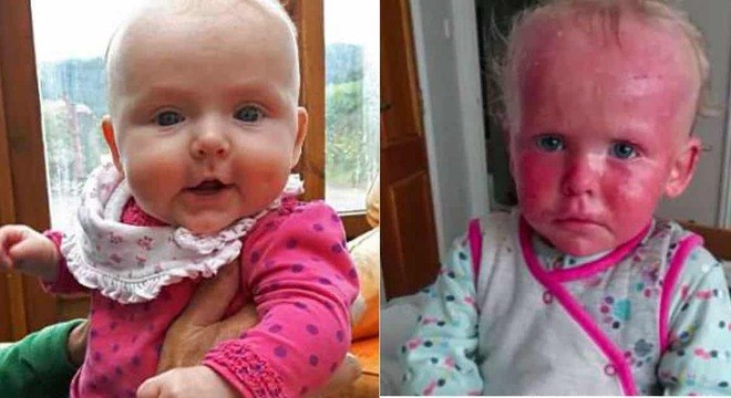 Os sintomas começaram no rosto de Maisie. “Seu rosto começou a ficar bem vermelho e depois a vermelhidão foi para suas pernas e cotovelos. E aos sete meses já estava em todo o corpo dela”, contou a mãe.