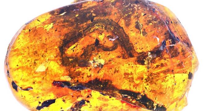 O corpo de uma cobra pode ser visto dentro de um pedaço de âmbar, composto de 97 vértebras, além das costelas. Curiosamente, a cabeça da cobra não está ali.