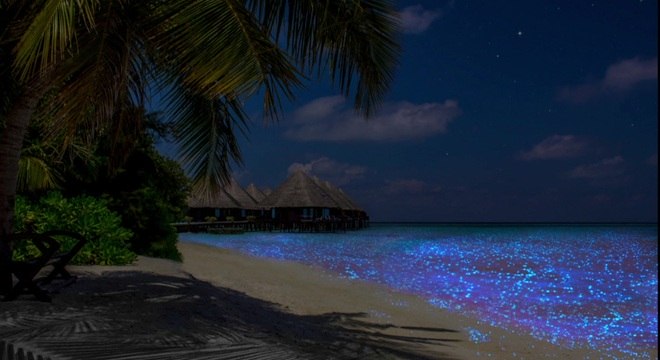 Nas Maldivas, as praias paradisíacas ganham novos contornos à noite, quando as águas que banham o arquipélago brilham no escuro, formando um verdadeiro mar de estrelas.