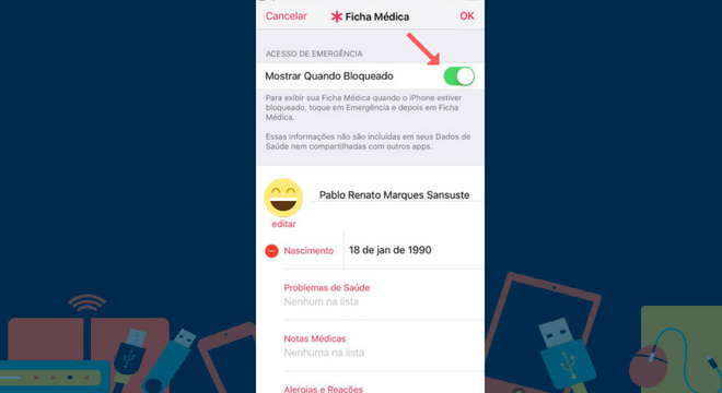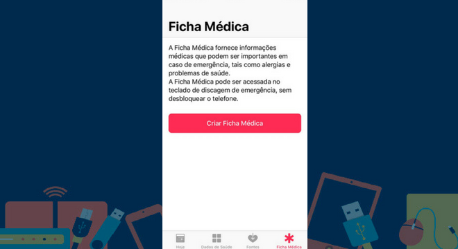 Ativando a função, será aberta uma tela para preencher uma ficha médica com tipo sanguíneo, alergias e outros problemas de saúde. Caso necessário, esses dados poderão ser acessados pelo teclado de discagem de emergência sem o desbloqueio do aparelho
