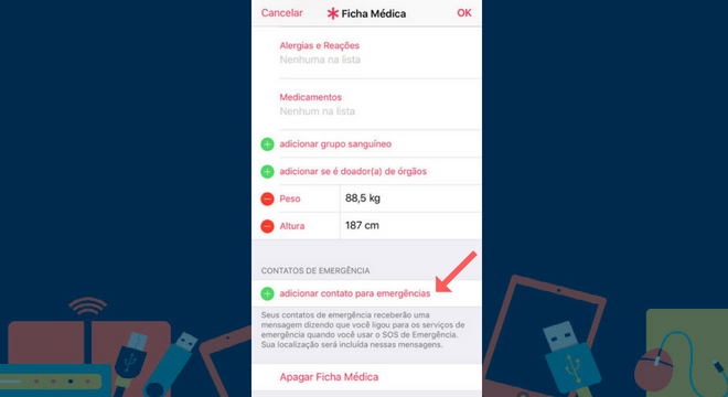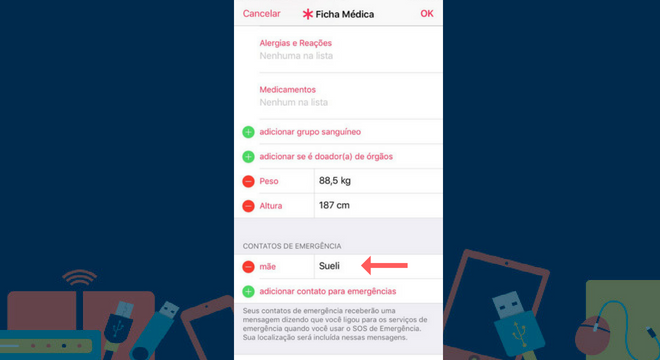 Depois que completar o preenchimento da ficha médica, toque em adicionar contato para emergência. Será aberta a agenda do celular e basta clicar nos contatos para incluir