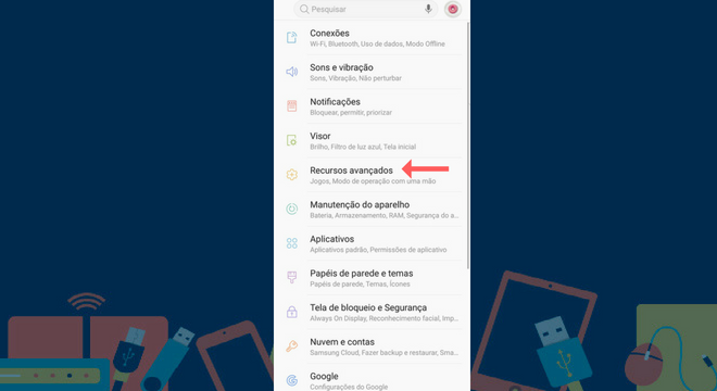 Nos aparelhos da Samsung, abra as configurações, deslize a tela até encontrar a opção recursos avançados