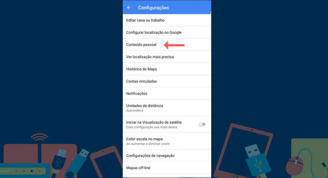 Ao abrir as configurações do Google Maps, toque em conteúdo pessoal