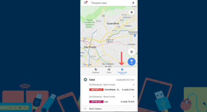 No caso do transporte público, surgirá algumas opções de caminhos de ônibus, de metrô ou de trem até o destino escolhido