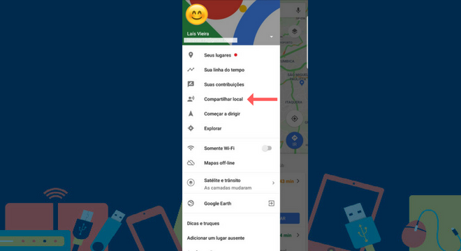 Após escolher o meio de transporte, toque nas três barrinhas do canto superior do seu smartphone. Em seguida, selecione o item compartilhar local