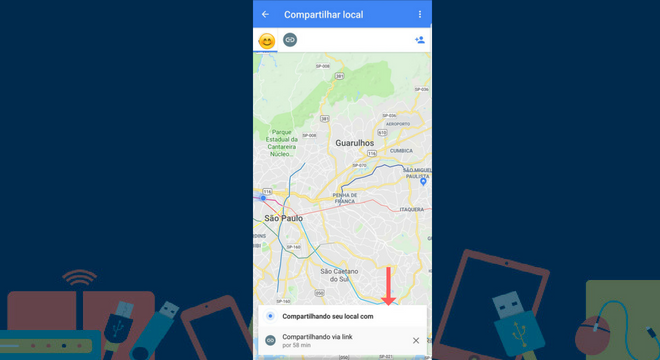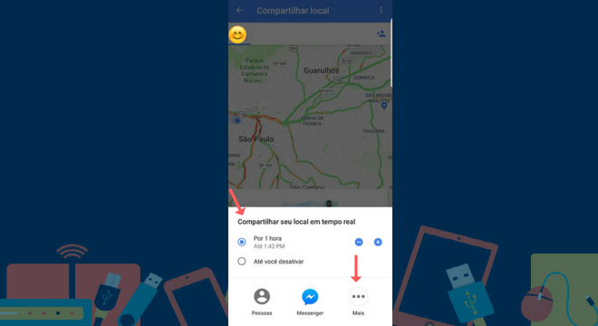 O próximo passo é decidir por quanto tempo a localização será compartilhada e por qual aplicativo. É possível enviar as informações do deslocamento pelo WhatsApp ou pelo Messenger, por exemplo