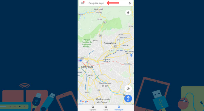 O primeiro passo é abrir o aplicativo do Google Maps no celular. Logo na página inicial, toque no campo de pesquisa, indicado por uma pequena lupa, e digite o destino