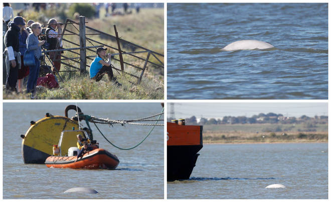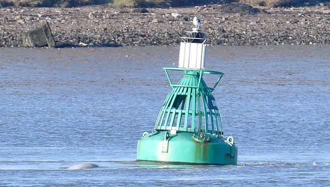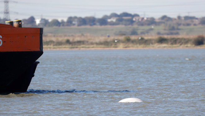 A baleia beluga branca, que apareceu na margem sul do rio Tâmisa, na cidade britânica, Gravesend, Kent, pela primeira vez na terça-feira (25). Como uma das suas características, as baleias navegam em águas profundas para se alimentar dos peixes e lulas