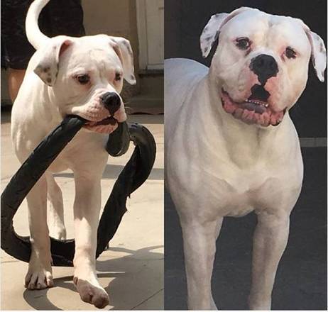 Um porquinho ou um cachorro? O Bolt Bruno tem 3 patas e foi adotado pelos donos quando tinha só um mês de vida e era bem rosadinho. Agora, com um ano e nove meses, ele está grande, forte e com uma pelagem branca