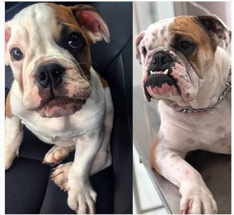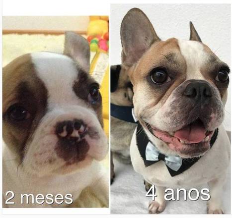 O Alex é um buldogue francês e a dona postou duas fotos para mostrar a diferença de tamanho do pet ao atingir a "puberdade"