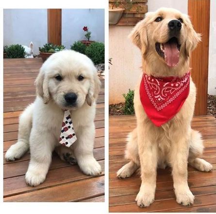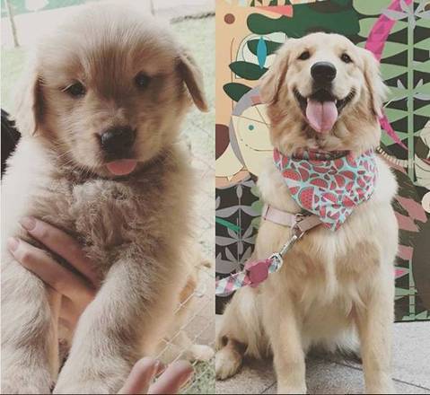 A golden amora provou ficou enorme em menos de um ano. Na primeira foto, a cachorra tinha só 45 dias e depois foi fotografada com 9 meses. A única coisa que permaneceu foi o charme da língua de fora