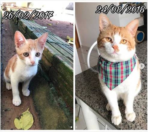 Depois de resgatado, o gatinho não só cresceu como ganhou peso e ficou mais forte