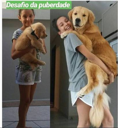 Esta foto é um "desafio da puberdade" duplo, do cachorro e também da dona. O golden cresceu tanto que não cabe mais no colo