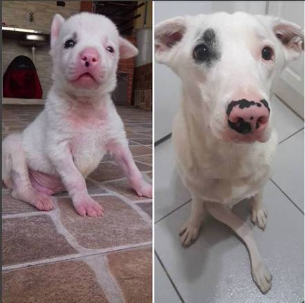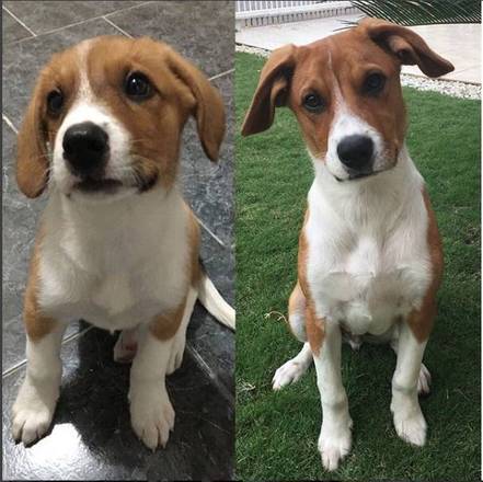Esses donos fizeram um desafio em dose dupla das irmãs Mel e Akira. Na primeira foto, elas são filhotes com 2 meses e depois estão na "puberdade" com 1 ano e 6 meses