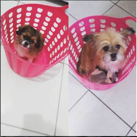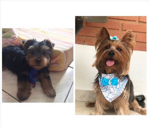 A yorkshire tinha a pelagem escura e curta quando era filhote. Depois de algum tempo, os pelos ficaram mais claros e a cachorrinha cresceu também