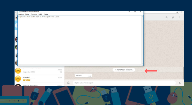 O outro truque não é tão simples, mas funciona muito bem. Abra a conversa que deverá ser lida sem notificar o contato e depois abra o bloco de notas sobre a janela do navegador. Desta forma, quando novas mensagens chegarem, será possível ler tudo sem ativar os sinais azuis