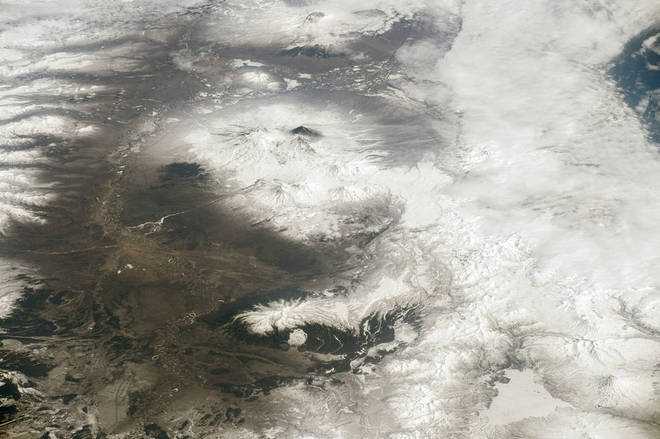 Os vulcões Kliuchevskoy, Bezymianny e Ushkovsky, na Rússia, estão em uma das regiões vulcânicas mais ativas da Terra. Os três foram fotografados por um astronauta a bordo da Estação Espacial Internacional em 4 de maio de 2015