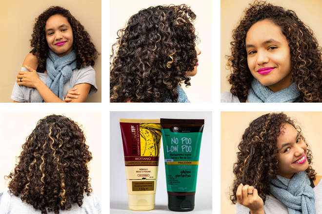 Bia Sanz define seu cacho como 3A e testou o finalizador No poo/Low poo, da Bio Extratus. O produto promete hidratar, proteger e facilitar a modelagem dos cachos.