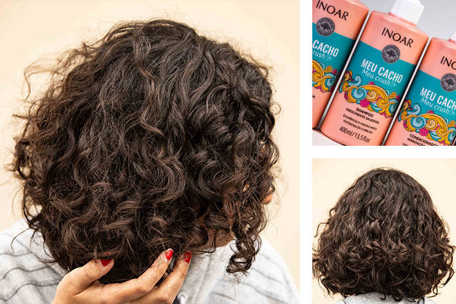 Juliana Almeida tem um cacheado solto, que só cacheia se usar produto para definir o cacho. Ela fez todo o passo a passo da linha Inoar Meu Cacho, Meu Crush, com pré-xampu, xampu, condicionador e o leave-in (R$ 22,90, cada um).