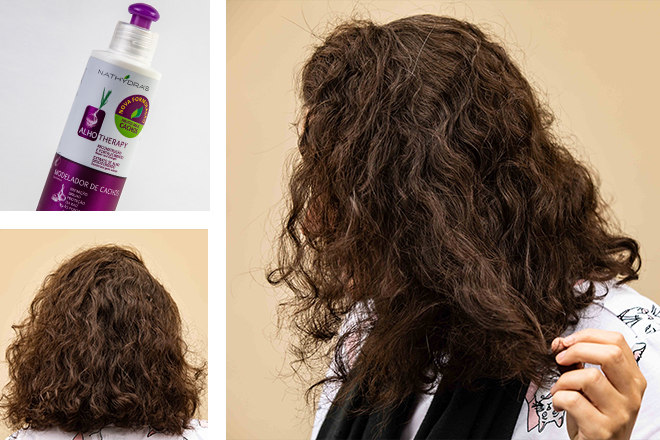 Ela testou o Nathydra´s Alho Therapy (R$ 19,90), produto que contém o extrato de alho na formulação e foi desenvolvido com uma textura mais leve, para facilitar os cuidados com os cachos.