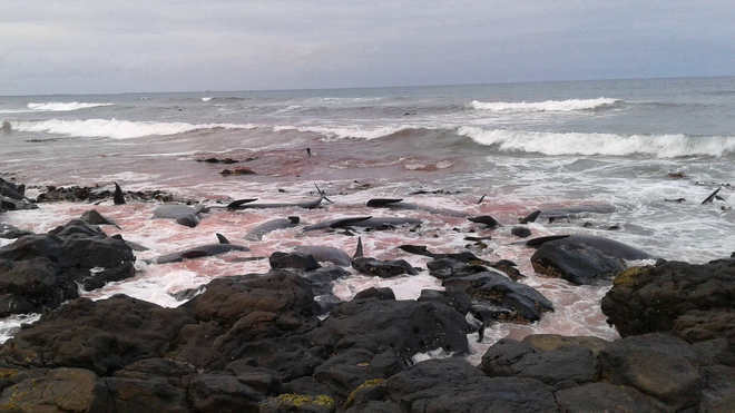 O que seria um longo e bonito trecho de praia deserta havia se tornado o local de uma desesperadora batalha pela vida: 145 baleias-piloto, encalhadas na maré-baixa, lutavam em agonia nas ondas suaves de uma área rasa.