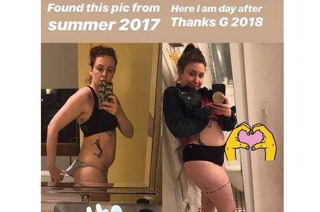 Na contramão da maioria das celebridades, que vive em busca de um corpo mais magro e sarado, a atriz Lena Dunham compartilhou em suas redes sociais uma foto em que mostra seu antes e depois, no intervalo de um ano, na qual exibe um ganho de peso.