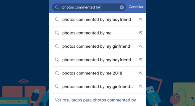 O recurso também pode ser usado para fazer uma pesquisa por fotos comentadas. Digite no campo de buscas "photos commented by" e digite o nome do amigo que será pesquisado