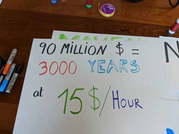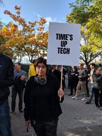 Uma das funcionárias do Google carrega uma placa com a frase "90 milhões de razões para mudar", uma referência à indenização paga ao executivo acusado de assédio sexual em 2013