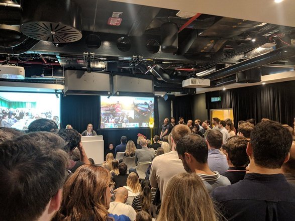 Em Londres, os funcionários não foram para a rua por causa do tempo. Por isso, todos desceram e ficaram em um auditório