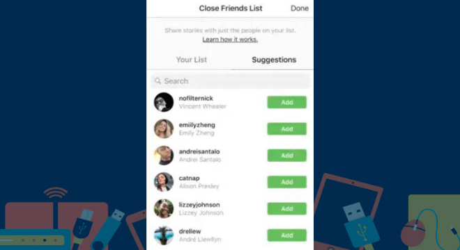 O Instagram irá exibir todo os contatos do perfil. Basta clicar no botão verde ao lado de cada foto para adicionar ao grupo privado