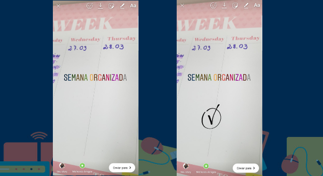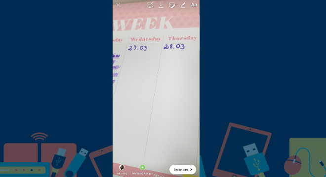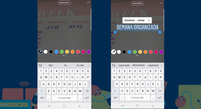 O Instagram possui uma paleta de cores para serem usadas em textos no Storie. O pincel disponível para modificação permite usar um tom diferente para cada letra
