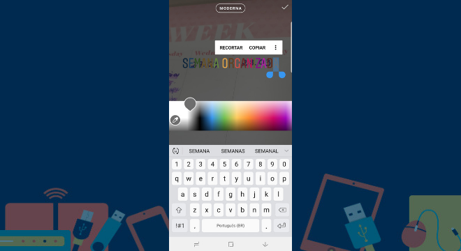 Escolha o tipo de fonte que irá usar na legenda e digite o texto. Depois, selecione todas as letras e segure o ponto azul embaixo da primeira letra. Ao mesmo tempo, pressione e segure uma cor qualquer até abrir todos os tons