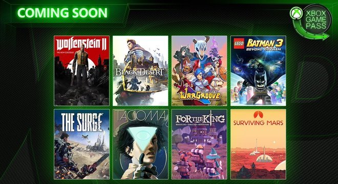 Wolfenstein II: The New Colossus - 2 de maio Wargroove - 2 de maio Tacoma - 9 de maio Black Desert - 9 de maio Surviving Mars - 9 de maio For the King - 10 de maio The Surge - 16 de maio Lego Batman 3 - 16 de maioEm abril, o serviço por assinatura recebeu a adição de games como Resident Evil 5, Prey e Monster Hunter: World. O Xbox Game Pass está disponível no Brasil pelo preço mensal de R$ 29. Também é possível realizar a assinatura anual, por R$ 199, com o cartão pré-pago do serviço.