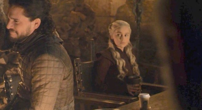 No início do capítulo Os Últimos Starks, Tormund abraça Jon Snow e dá exemplos de por que ele é um grande líder durante um banquete de comemoração no castelo de Winterfell - enquanto isso, ao fundo, você pode observar um copo de café em cima da mesa.