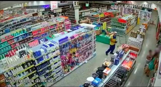 Pelas imagens é possível acompanhar o momento em que o homem, que vestia o uniforme dos correios, caminha entre os corredores até uma mulher. Ele simula estar procurando por um produto e se agacha ao lado da vítima. Em seguida, o celular é colocado debaixo da sai e uma foto é tirada. O homem repete o gesto com outras mulheres.
