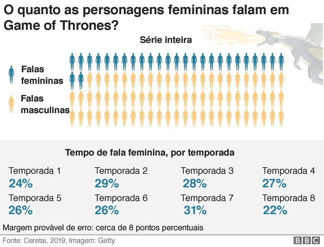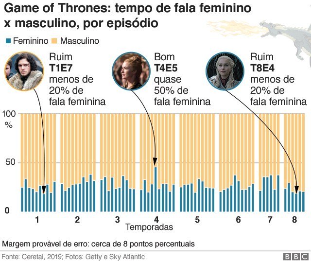A última temporada de GoT teve a menor porcentagem de fala feminina: apenas um quinto do tempo total de fala, segundo o levantamento do algoritmo.