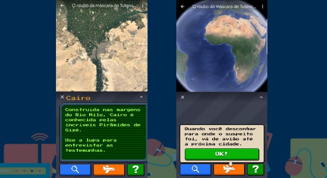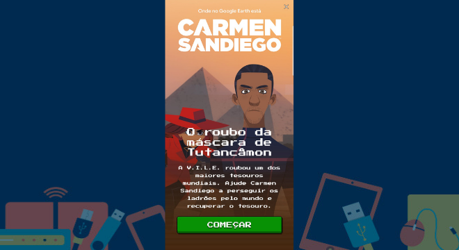 Abra o aplicativo do Google Earth no seu aparelho, depois, no lado esquerdo inferior da tela, toque no ícone da Carmen Sandiego. Por fim, clique em vamos lá