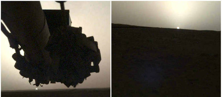 A Nasa publicou duas fotos impressionantes de Marte. O braço robótico da sonda Insight fotografou a linha do horizonte com o pôr do sol e o nascer do sol no planeta vizinho.