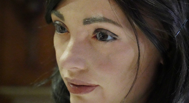 Vestindo uma blusa branca e de cabelos escuros soltos, Ai-Da parece uma artista no trabalho enquanto estuda e coloca lápis no papel. Mas o bipe de seu braço biônico a entrega - Ai-Da é um robô.