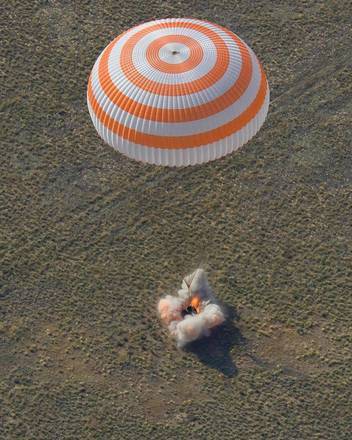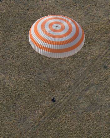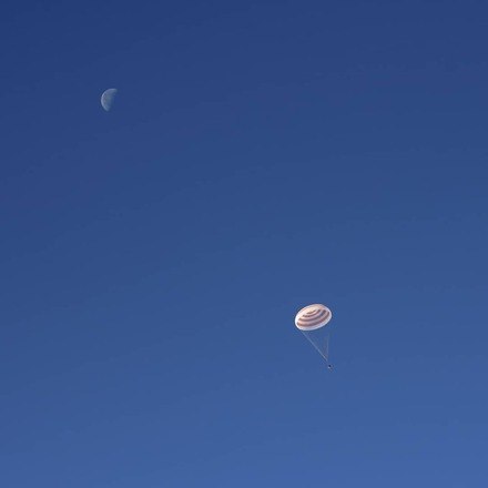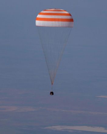 Os três fizeram a viagem de volta abordo de uma nave Soyuz MS-11 e pousaram em segurança em uma área desértica do Cazaquistão