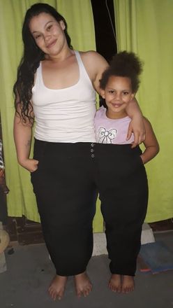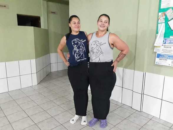 Na aula de zumba, Carla levou uma calça que costumava usar quando pesava 202 quilos. A calça, de número 72, conseguiu abrigar ela e uma colega, uma em cada perna.