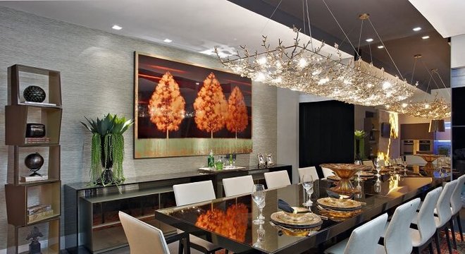 A mesa de jantar retangular gigante, por exemplo, se mostra muito versátil em ambientes amplos, uma vez que sua estrutura tem o poder de acomodar inúmeras pessoas ao mesmo tempo. Em ambientes amplos a mesa retangular pode ser posicionada no centro do cômodo e receber inclusive uma iluminação decorativa especial como no ambiente abaixo.